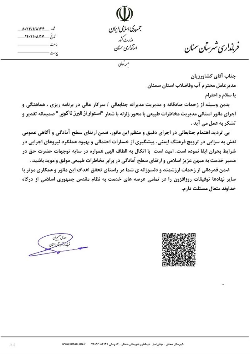 در قسمتی از این تقدیرنامه آمده است: " بی تردید اهتمام جنابعالی در اجرای دقیق و منظم این مانور ، ضمن ارتقای سطح آمادگی و آگاهی عمومی نقش به سزایی در ترویج فرهنگ ایمنی ، پیشگیری از خسارت احتمالی و بهبود عملکرد نیرو های اجرایی در شرایط بحران ایفا نموده ، امید است با اتکال به الطاف الهی همواره در سایه توجهات حضرت حق در مسیر خدمت به میهن عزیز اسلامی و ارتقای سطح آمادگی در برابر مخاطرات طبیعی موفق و موید باشید ."